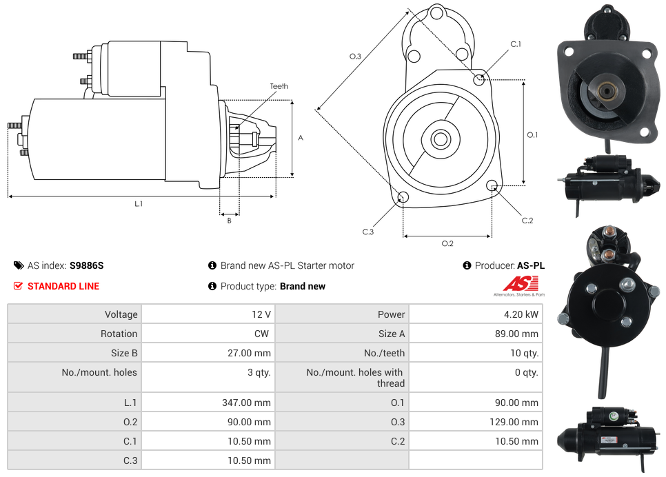 Startmotor 12V 4.2kW (10 tænder)