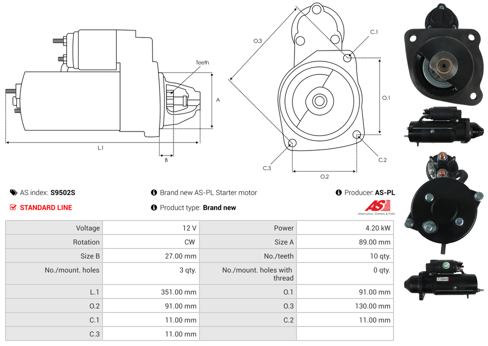 Startmotor 12V 4.2kW (10 tænder)