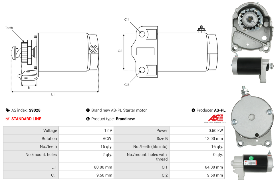 Startmotor12V 0.5kW (16 tænder)
