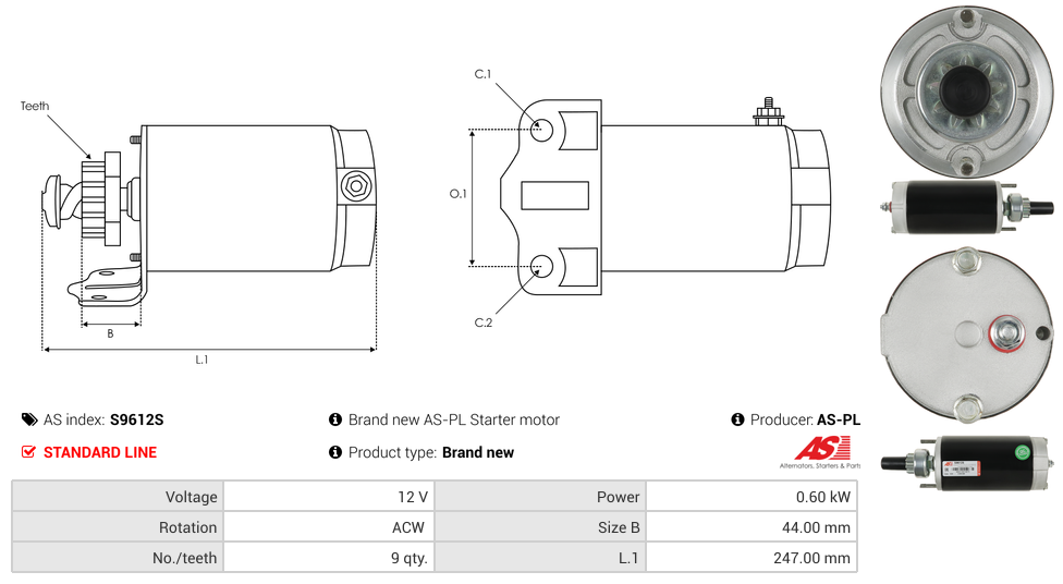 Startmotor12V 0.6kW (9 tænder)
