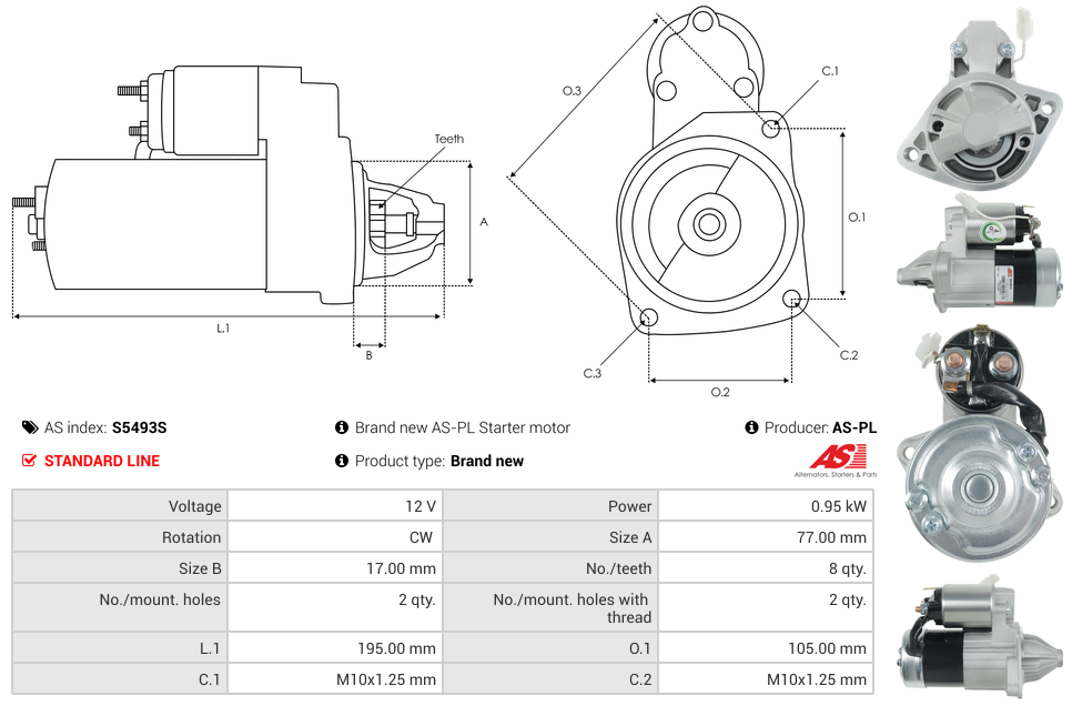 Startmotor12V 0.95kW (8 tænder)