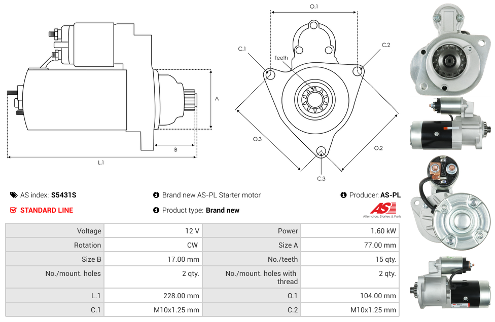 Startmotor12V 1.6kW (15 tænder)