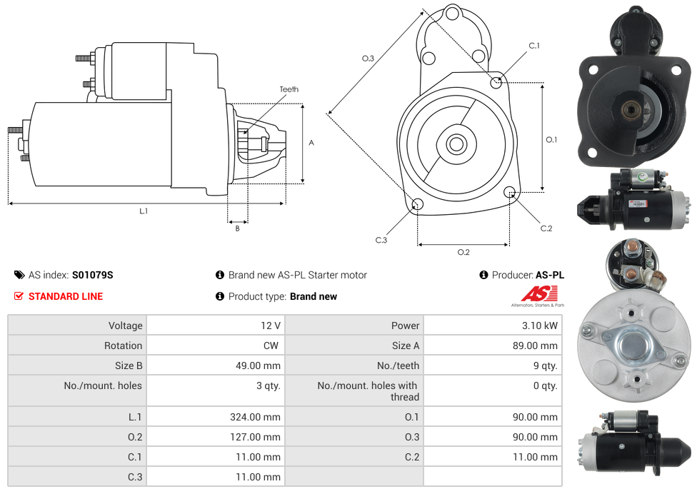 Startmotor12V 3.1kW (9 tænder)